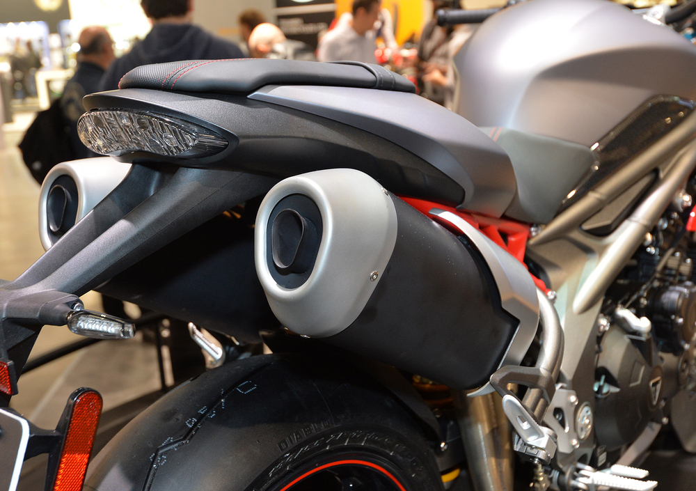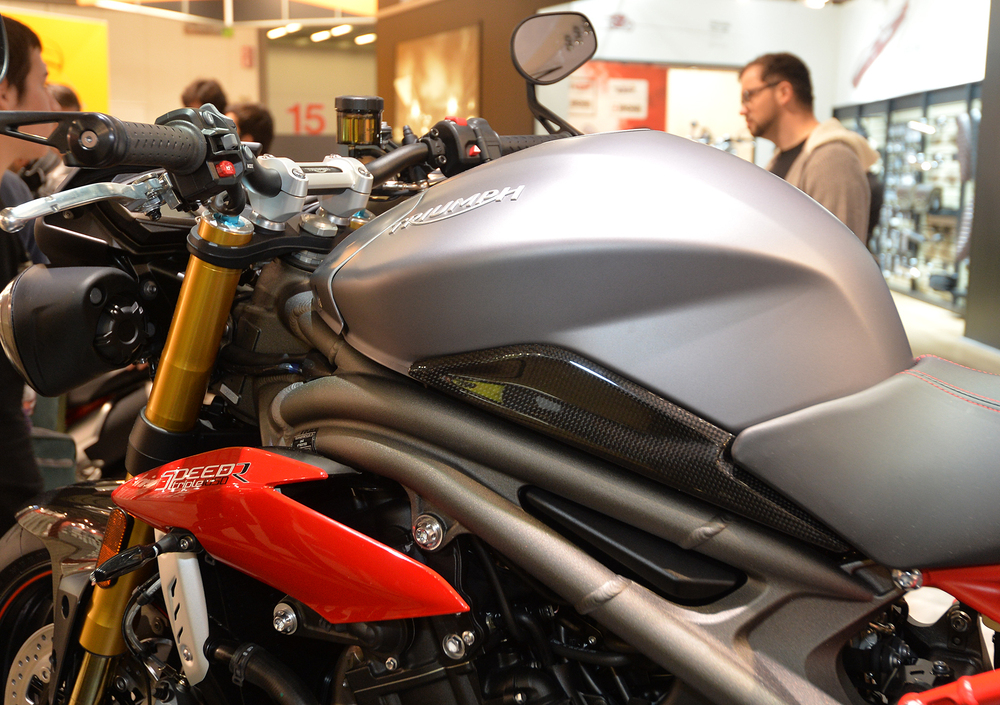 Le nuove Triumph Speed Triple S e Speed Triple R si presentano a EICMA 2015 riviste in molti, significativi dettagli. Partiamo dal frontale, che ha fatto molto discutere nel 2011 al lancio della nuova versione. Le Speed 2016 cambiano faccia e ricevono un fanale doppio (obbligatorio, vista la storia di questa moto) più basso e dotato di luci DRL incorporate. È rivista anche la linea, che giova di un alleggerimento generale. Il radiatore è infatti più piccolo e sono quindi di dimensioni più contenute anche i fianchetti che lo coprono lateralmente. La Speed riceve un codone che richiama quello della Triumph Daytona 675R e che ha spinto gli ingegneri inglesi a riprogettare il telaio posteriore e gli scarichi, ora più leggeri e in grado di offrire un flusso migliore ai gas in uscita.