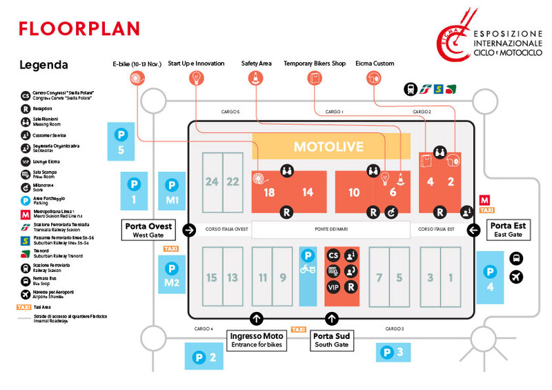 Dopo la ricollocazione dello scorso anno per concomitanze dovute ad EXPO, EICMA torna alla solita disposizione "allungata", nei padiglioni pari dal 2 al 18. Il Salone sarà aperto al pubblico da giovedì 10 fino a domenica 13 novembre, mentre martedì 8 e mercoledì 9 saranno riservati a stampa ed espositori.