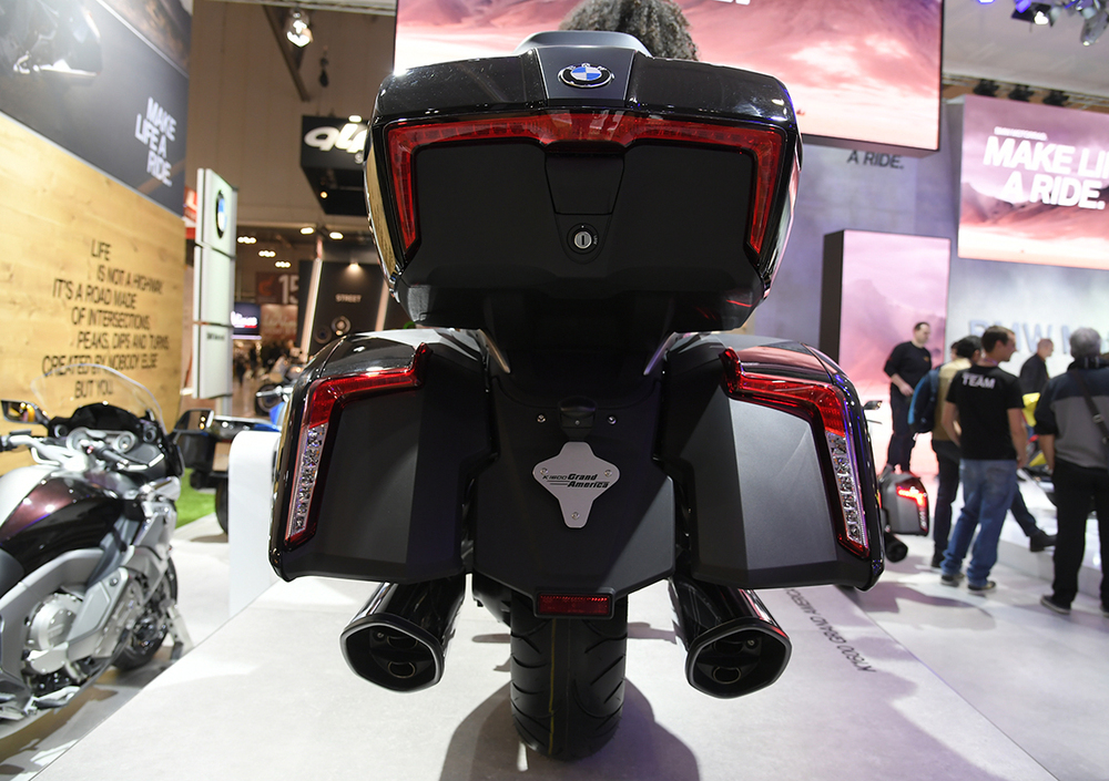 Il capiente top-case (può ospitare due caschi integrali e altro ancora) comprende il poggiaschiena per il passeggero e luci a led posteriori che fanno il paio con quelle sottili presenti sulle borse rigide laterali; sotto le quali corrono i due lunghi silenziatori cromati. Il telaio posteriore più basso di 70 mm rispetto alle note K è abbinato a pedane per il passeggero più basse della stessa misura.