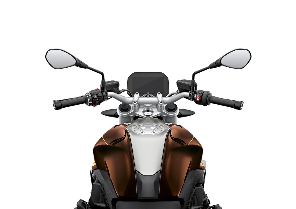 Esteticamente non ci sono grossi cambiamenti. Come ci si poteva aspettare, arrivano nuove colorazioni: Black Storm metallic, Pollux metallic matt, la versione HP e uno speciale marrone con dettagli dorati (guardate la gallery). Compaiono nuovi dettagli come il logo R sopra il faro a LED anteriore, i fianchetti a lato del radiatore e un puntale (di diverse dimensioni a seconda dell’allestimento) davanti al propulsore. Ricco pacchetto elettronico che va dall’ASC al Hill Start Control, passando per diversi riding mode (alcuni dei quali in optional), e non manca il nuovo cruscotto totalmente digitale TFT da 6.5”.