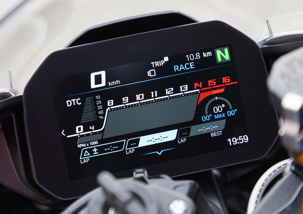 Tutto nuovo anche il ponte di comando, con un bellissimo pannello TFT da 6,5" configurabile su quattro visualizzazioni che alternano contagiri a visualizzazione analogica o digitale, e tutte le informazioni a cui il display LCD della precedente S1000RR ci aveva abituato oltre a diverse altre.