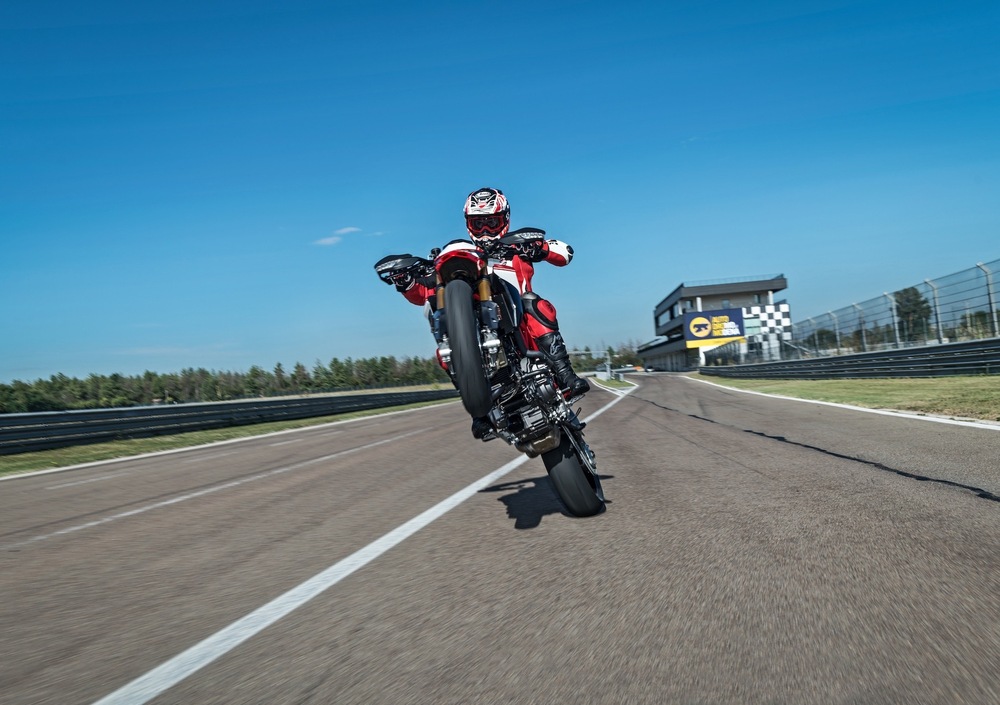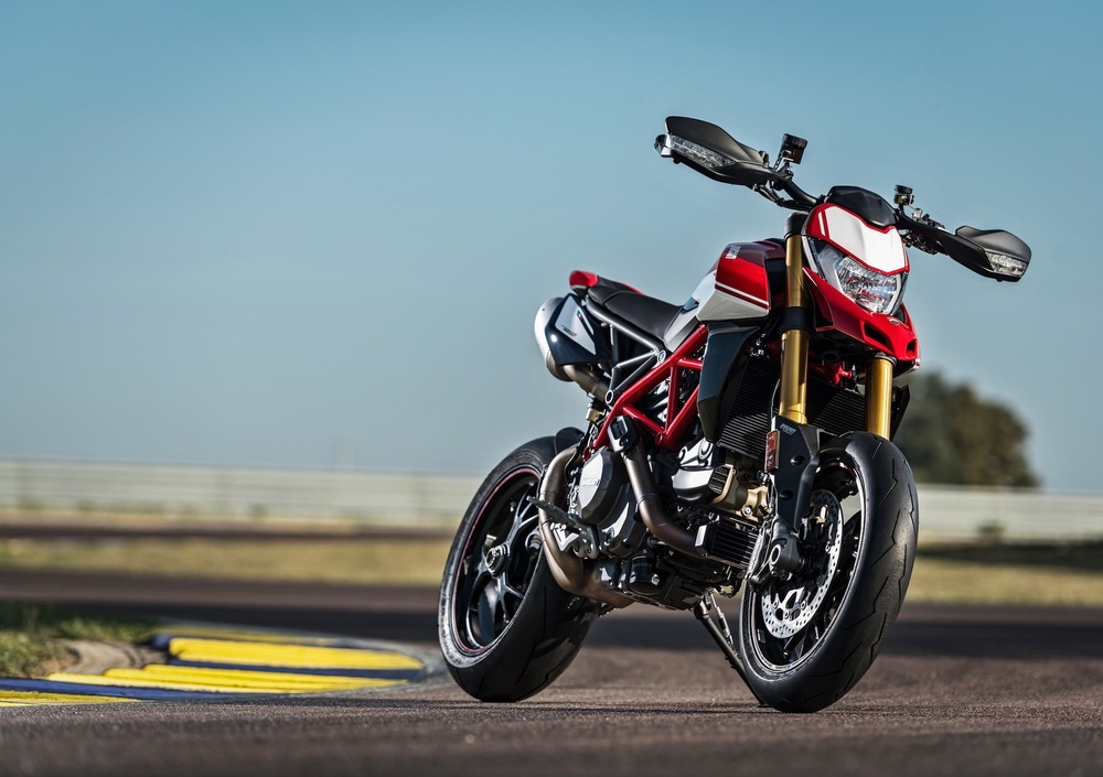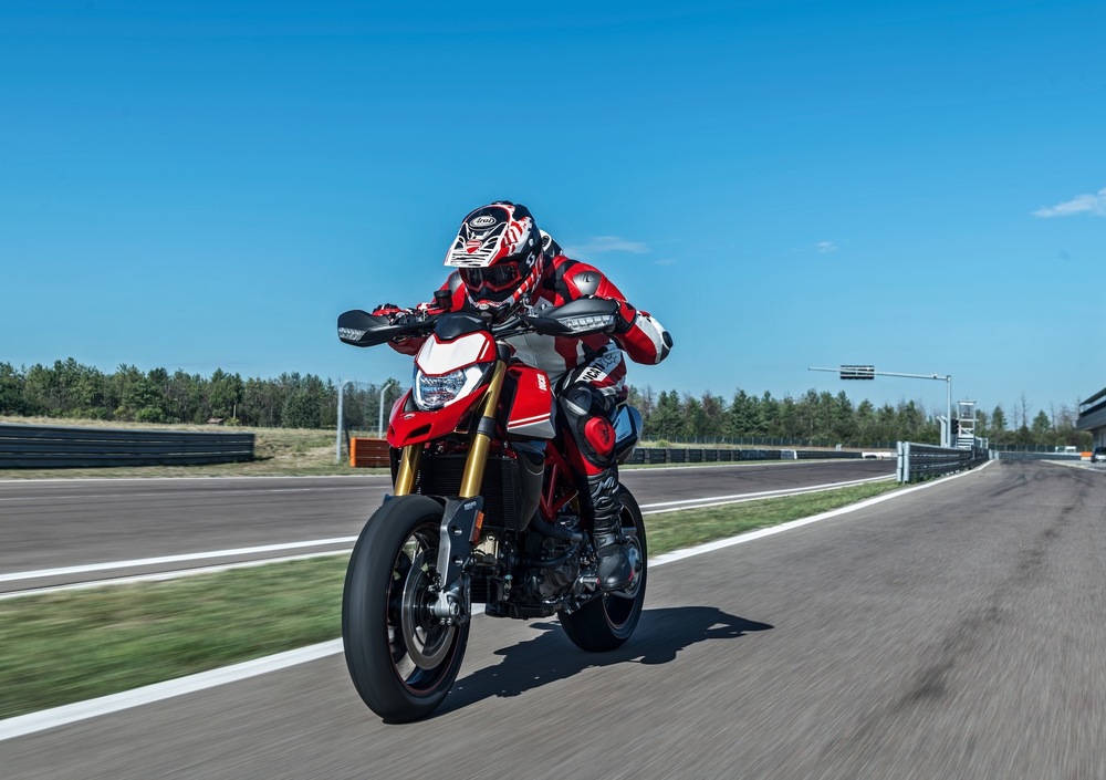 L’impianto frenante anteriore è caratterizzato da una coppia di pinze radiali monoblocco M4.32 Brembo a 4 pistoncini con dischi da 320 mm e flange in alluminio (che hanno permesso un risparmio totale di 600 grammi), mentre al posteriore troviamo un singolo disco da 245 mm. I cerchi in alluminio con 3 razze a Y con sezione da 3,5’’ davanti e 5,5’’ calzanti Pirelli Diablo Rosso III 120/70 all’anteriore e 180/55 al posteriore, più leggeri di 800 grammi rispetto a quelle del 939 sulla Hypermotard 950, cedono il passo a leggerissime unità Marchesini forgiate con 3 razze a Y con sezione da 3,5’’ davanti e 5,5’’ dietro con Pirelli Diablo Supercorsa SP v3 sulla Hypermotard 950SP.