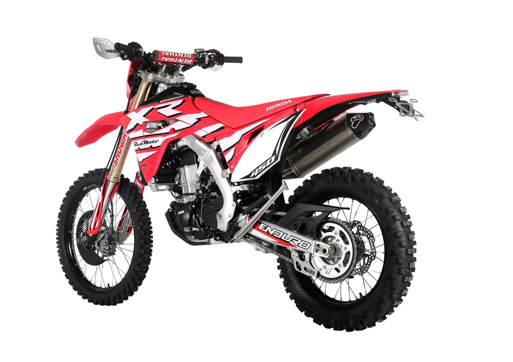 maggiorato con l’adozione della ventola. L’impianto luci è full-LED, comprese frecce e luce targa. Il tachimetro, l’avvisatore acustico, l’interruttore delle luci di stop e gli specchietti rispettano i requisiti legali per la circolazione stradale. Il serbatoio della CRF450XR è in titanio con capacità di 7,6 litri. La dotazione di serie è completata dai paramani protettivi.
