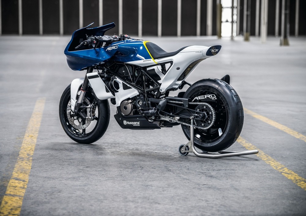 Come si era già visto per la 401, anche per la Vitpilen 701, Husqvarna ha dedicato un prototipo dal look molto speciale. La carena tondeggiante, che abbraccia il faro anteriore, nasconde il motore monocilindrico della 690 da 75 CV. Come potete vedere la colorazione è da vera moto da pista: blu e bianca con il faro coperto. Ovviamente non ci sono gli specchietti e la targa; e guardate il cerchio dietro chiuso per ottimizzare i flussi d’aria. Si tratta di un concept che attira gli sguardi: speriamo si tratti dell’ennesimo esperimento che diventerà di serie nei prossimi anni.