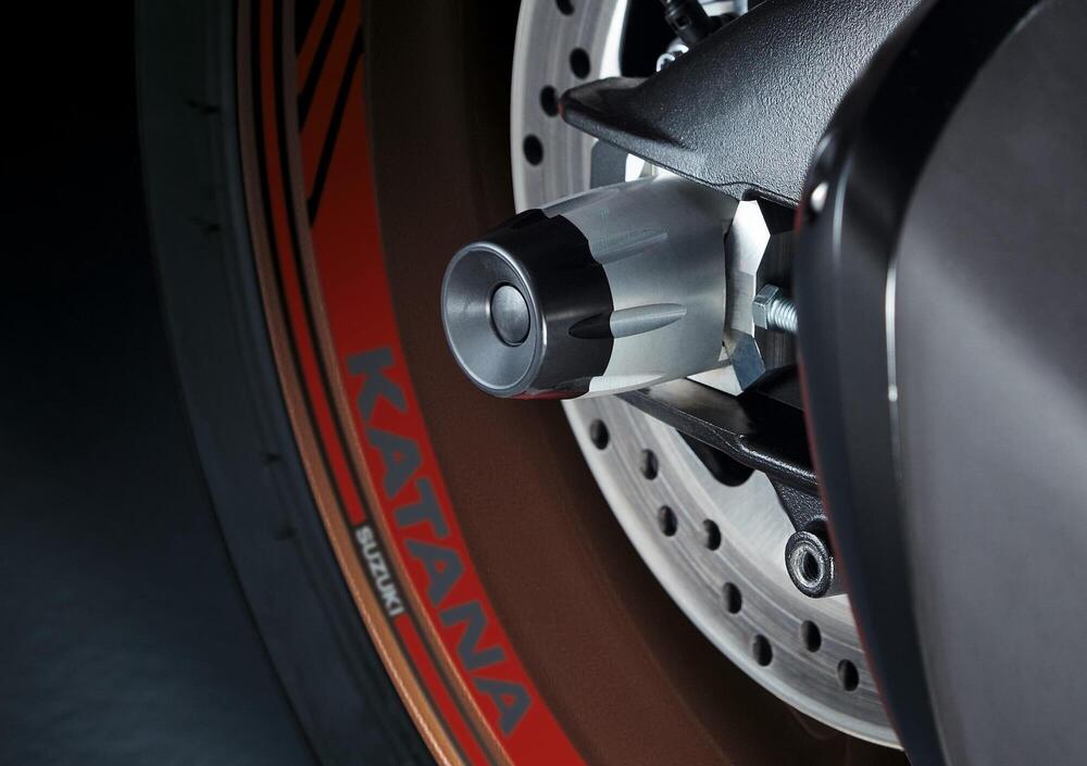 Chi conosce la Suzuki Katana riconoscerà fin dal primo colpo d'occhio il modello nuovo grazie al cambio di colorazione di diversi dettagli tecnici. La forcella ha i foderi colorati in oro invece che nel nero della precedente versione, i cerchi non sono più neri ma hanno colorazione coordinata alle due livree (dorati sulla blu, rossi sulla grigia) e la molla del monoammortizzatore diventa grigia invece che rossa. Anche la chiave di accensione cambia, con il kanji Katana sull'impugnatura.