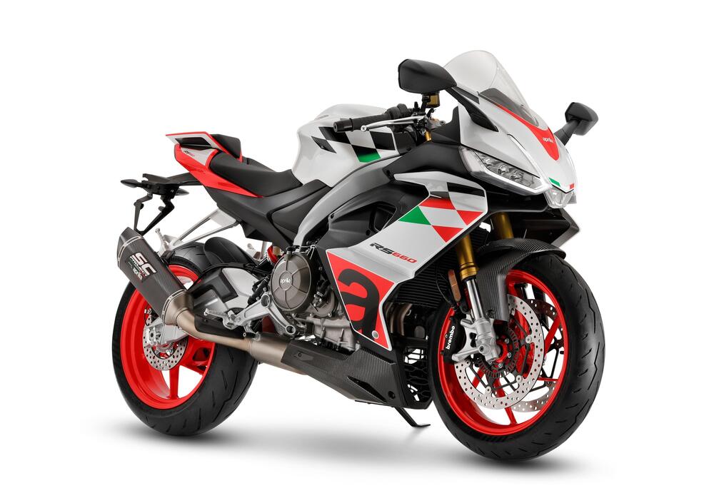 A corredo è fornita la staffa di supporto del silenziatore, in alluminio anodizzato nero, che permette di rimuovere le pedane passeggero portando a un ulteriore alleggerimento. Ci sono poi il parafango anteriore e il nuovo puntale sotto il motore, dall’inedito design, entrambi realizzati in fibra di carbonio.