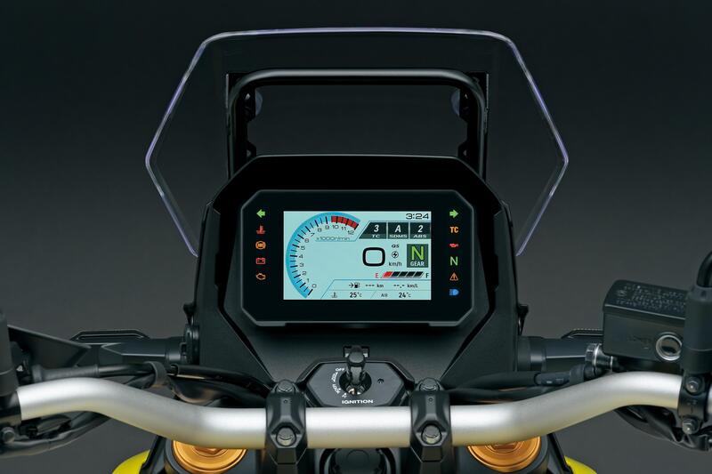 I fari a LED richiamano le ultime novità Suzuki, mentre il parabrezza è regolabile su tre posizioni. Un display multifunzione TFT LCD a colori costituisce la strumentazione. La sella è a 855 mm.