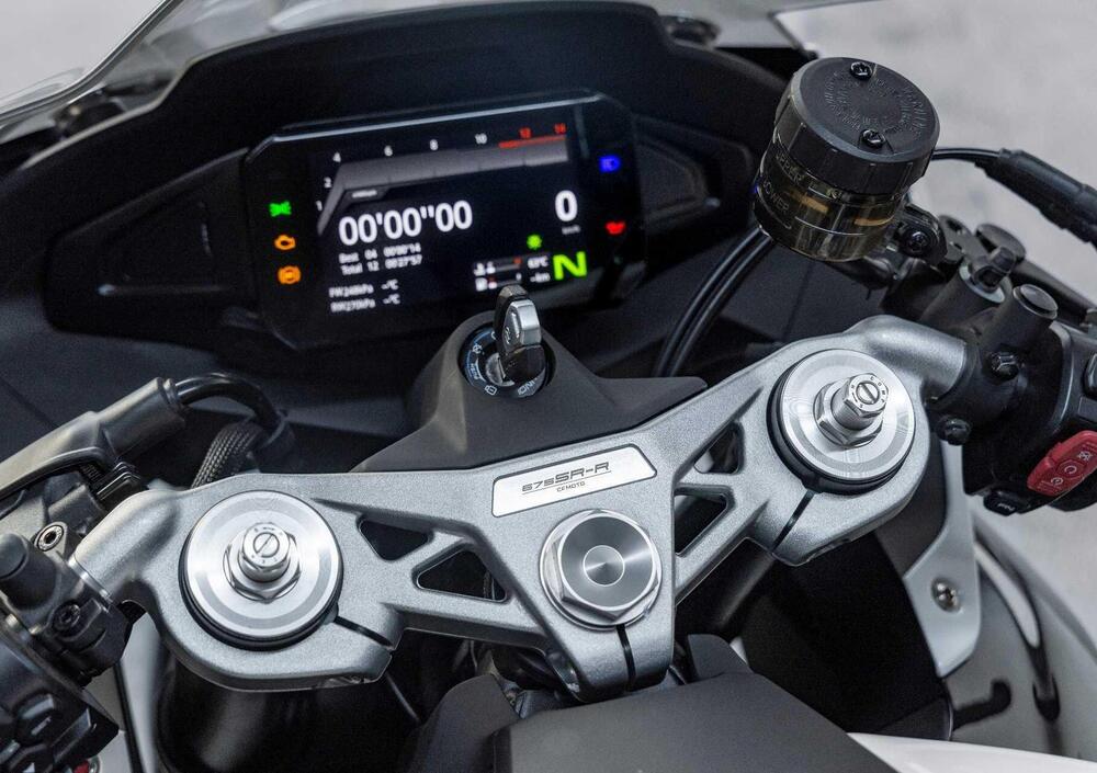 La 675SR-R ha una dotazione tecnologica completa: controllo di trazione regolabile su due livelli o disinseribile, dashboard TFT da 5” dotato di connettività e App dedicata CFMOTO Ride App, doppia presa USB (tradizionale e type C), aggiornamenti software OTA e la fanaleria Full LED.