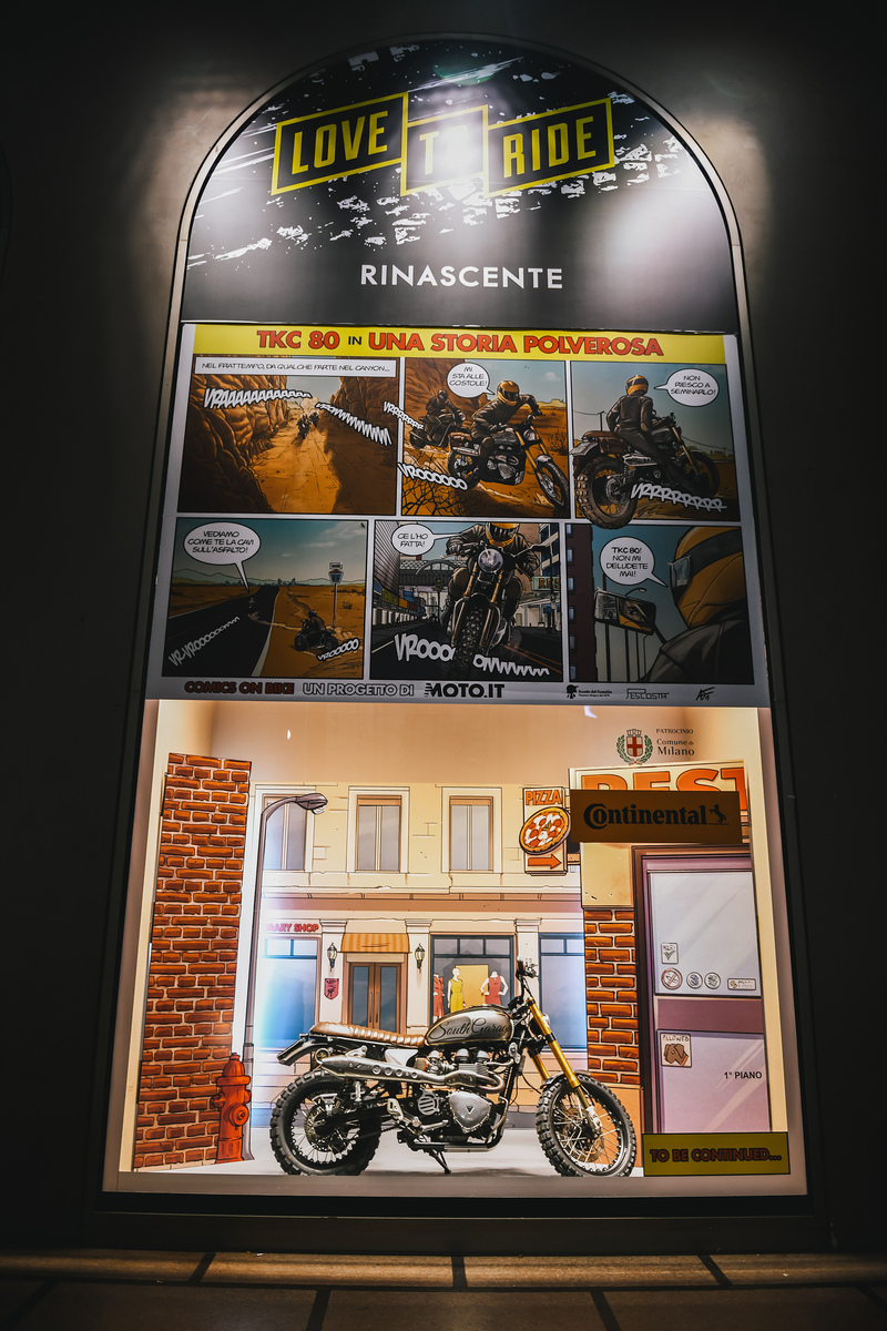 La natura di questa gomma trova una rappresentazione perfetta nel fumetto realizzato da Marianna Pescosta per la vetrina Continental in Rinascente: racconta la storia di un motociclista che fugge dal proprio inseguitore, prima in off-road e poi su strada, riuscendo a seminarlo proprio grazie alla grande versatilità del TKC 80.