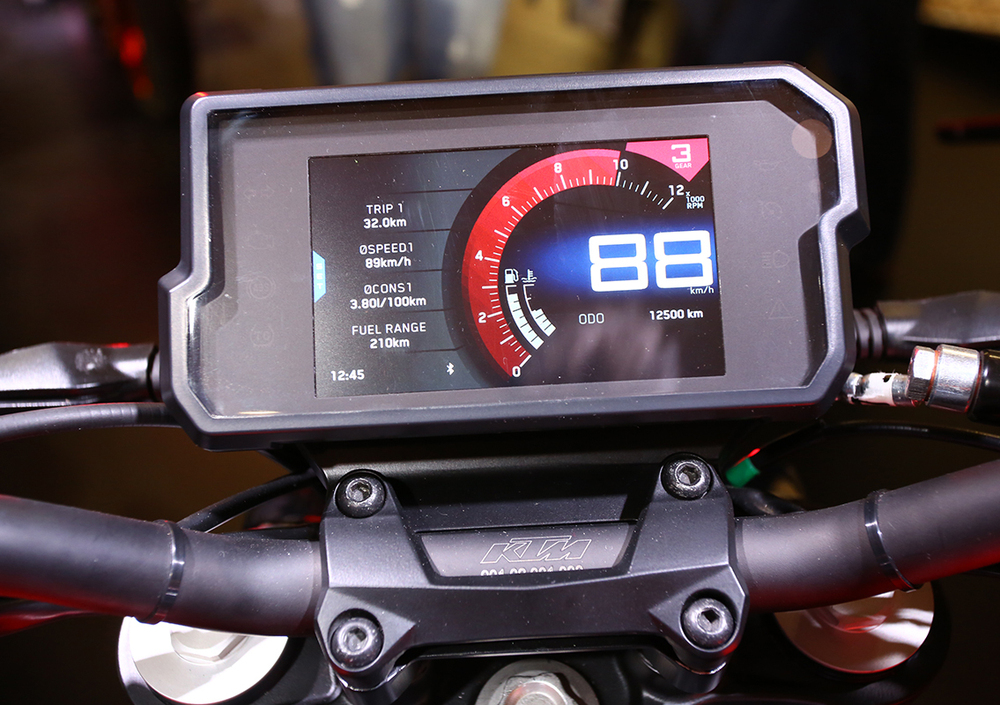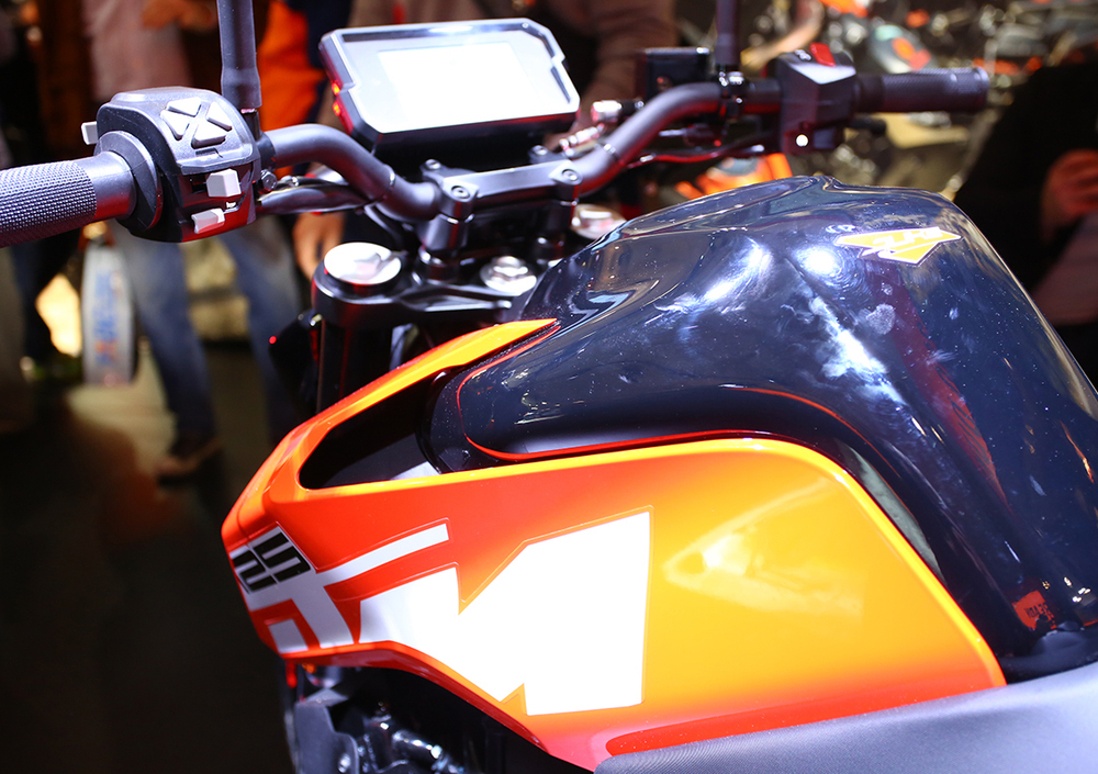 Le plastiche sono state riviste da cima in fondo: le linee sono più affilate e aggressive. I tecnici austriaci hanno montato un silenziatore laterale, sia per questioni di omolagazione Euro 4 sia per farla assomigliare ancora di più alla sorella maggiore. Per rendere ancora più stuzzicanti le Duke 125 e 250, sono stati montati dei fanali a LED e un display TFT digitale a colori in grado di supportare l’opional “KTM my Ride” (con fuzione hands-free e audio player).