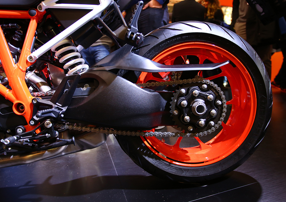 Le novità riguardano anche la ciclistica: la forcella WP da 48 mm, completamente regolabile, ha molle più dure per migliorare la guida sportiva e anche il monoammortizzatore WP è dotato di una molla più dura (10 N/mm). Inoltre, per garantire più stabilità in accelerazione, è presente un ammortizzatore di sterzo marchiato WP. Per fermare questo missile senza carene, KTM si è affidata sempre a Brembo, con pinze anteriore radiali monoblocco affiancate dall’ABS Bosch con funzione Cornering.