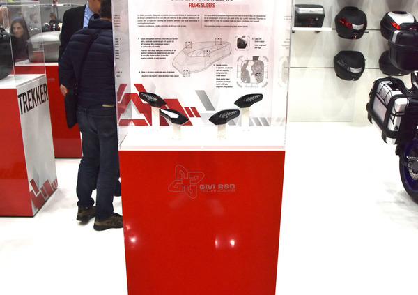Attraverso una serie di teche e di totem, con il supporto di un tecnico, GIVI racconta al pubblico alcuni prodotti allo studio, enfatizzandone le linee progettuali.