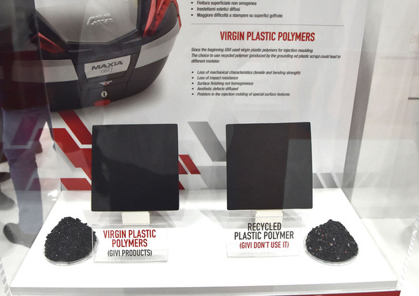 Focus sulla qualità dei materiali utilizzati da GIVI in produzione. Nella teca le sezioni di una valigia in alluminio e di una in tecnopolimeri (riciclabile, ma non riciclata) e uno spazio che mostra al pubblico la materia prima.