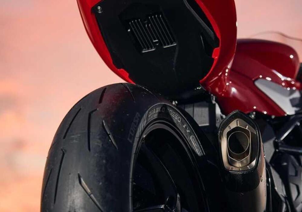 Il motore 1000cc quattro cilindri in linea, prodotto artigianalmente a Varese, rispetta ora le normative Euro5+ ed eroga 201 CV a 13.500 giri/min e 116 Nm di coppia a 11.000 giri/min. Si distingue per componenti premium come valvole radiali e bielle in titanio e camme con rivestimento DLC, offrendo maggiore reattività ai bassi regimi e vibrazioni ridotte.