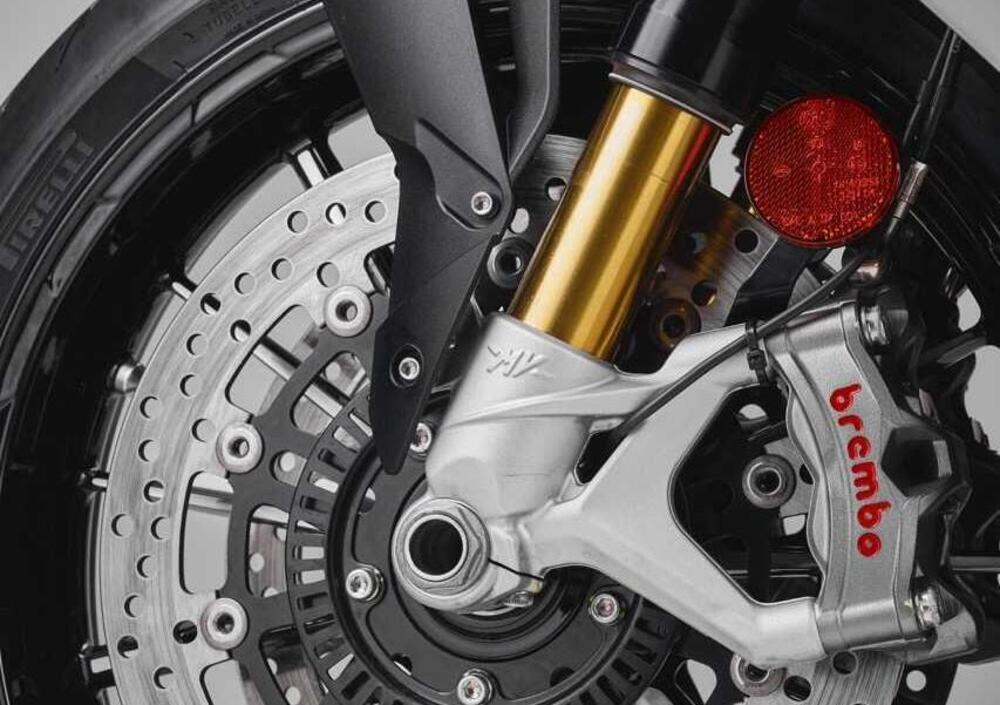 L'impianto frenante Brembo comprende dischi anteriori da 320 mm con flange in alluminio e pinze Stylema radiali (pistoni da 30 mm), mentre al posteriore monta un disco da 220 mm con pinza a 2 pistoni. Il sistema include ABS con modalità Sport e Race e funzione cornering per la massima sicurezza in curva.