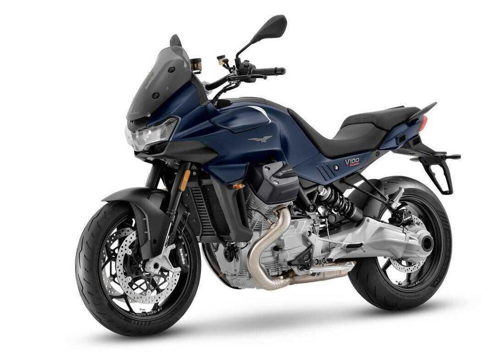 Moto Guzzi V100 Mandello è proposta in due nuove tinte metallizzate opache, Blu Oceano e Grigio Titanio, abbinate a cerchi verniciati in nero opaco e teste motore nere.