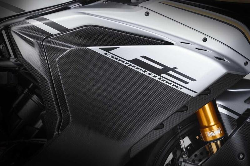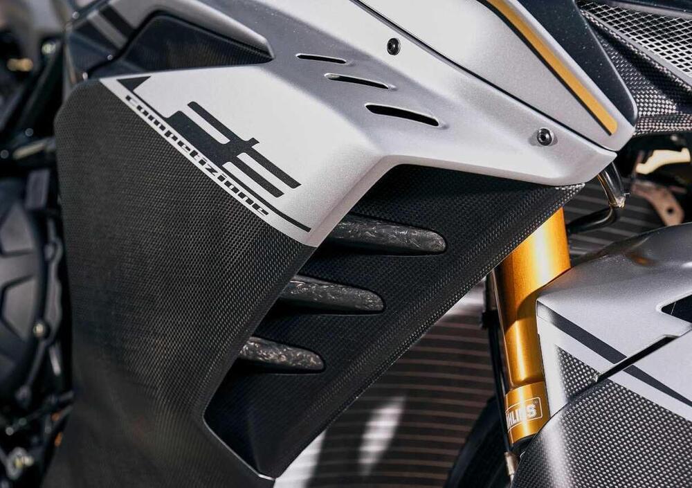 La già avanzata configurazione aerodinamica della F3 RR non è stata toccata. Le appendici aerodinamiche integrate nella carena e realizzate in fibra di carbonio forgiata possono generare un carico di 8 kg sull’avantreno alla velocità di 240 km/h. Il pacchetto aerodinamico include il cupolino racing fumé, le fiancate della carena ed il parafango anteriore in fibra di carbonio. Quest’ultimo è disegnato per ottimizzare il flusso d’aria sia per raffreddare le pinze anteriori, sia per garantire temperature ottimali del motore. L’obiettivo è quello di conservare il Cx eccellente, tipico dell’F3, a fronte del carico sull’avantreno e della maggiore resistenza all’avanzamento determinata dalla presenza delle appendici. Tutte le componenti con funzione aerodinamica sono realizzate in fibra di carbonio con cura artigianale. E a proposito di attenzione maniacale al dettaglio anche sul design è stata massima. Fonte d'ispirazione è stata la F4 Claudio nella scelta dei colori, Satin Metallic Carbon Black, Satin Intense Silver e Oro, e dal massivo utilizzo del carbonio a vista. La sella è rivestita in Alcantara, spicca per raffinatezza e garantisce nella guida grip ed ergonomia ideali. A livello estetico un plus è rappresentato dalla finitura dorata di alcuni componenti: in particolare le flange dei dischi anteriori e la corona. Un ulteriore tocco di unicità è la targhetta numerata (XXX/300) posta sulla nuova piastra di sterzo ricavata dal pieno con lavorazione alle macchine utensili (CNC).