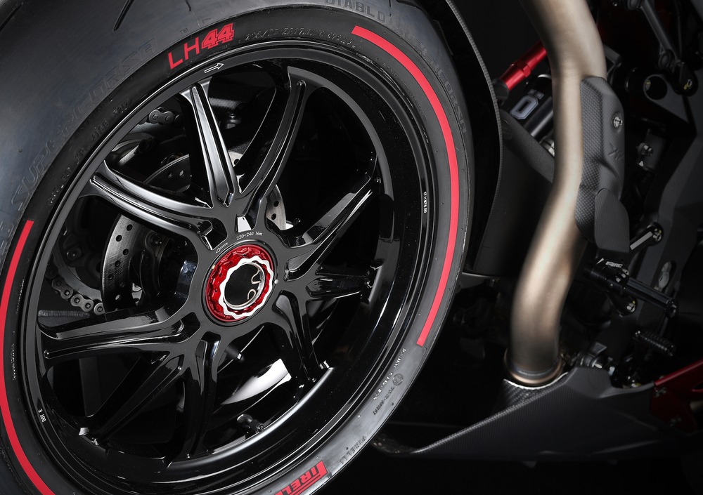 L'impianto frenante rimane invariato, mentre un tocco di esclusività arriva dagli pneumatici di primo equipaggiamento, ovvero i Pirelli Supercorsa SP realizzati in versione dedicata con i fianchi in colorazione rossa e riportanti il logo LH44. Completano il quadro diversi dettagli di pregio, come la sella in pelle naturale ed Alcantara, il tappo serbatoio racing, i cerchi forgiati, e pezzi unici come il dado ruota posteriore, che per la F4 LH44 è stato lavorato alle macchine utensili CNC anche dopo l’anodizzazione.