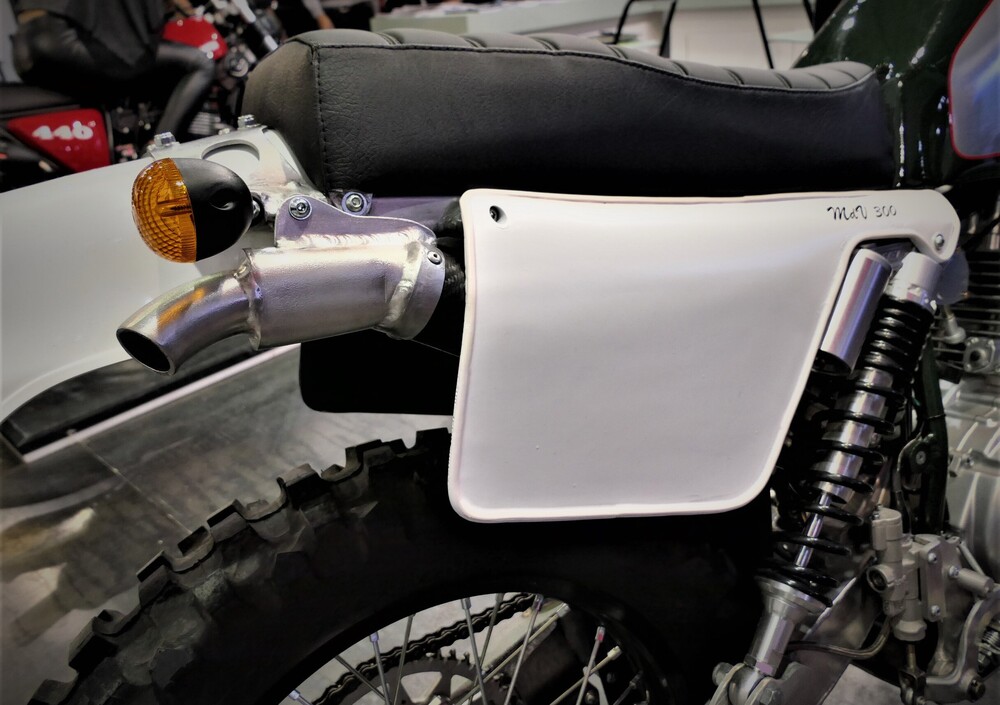 Il motore è prodotto dal colosso cinese Loncin su base Suzuki 250 (vi ricordate quello della TU 250? Quello, sì, però maggiorato a 300 cc), omologato Euro 4 e dotato di un bellissimo impianto di scarico realizzato a mano che passando sotto il motore diventa una camera di compensazione-piastra paracolpi (spessa 2,5 mm), per raccordarsi senza quasi soluzione di continuità, alla piastra in ergal a protezione di motore e telaio. I catalizzatori sono addirittura 5 (tre ospitati nella camera di compensazione, più uno per ogni collettore di scarico che fuoriesce dalla testa); e la resa è tale che è stato possibile adottare un minuscolo silenziatore in fibra di carbonio del diametro di soli 60 mm, semi celato dalla tabella porta numero destra; mentre il tubo di scarico che passa dentro il forcellone razionalizza gli ingombri. Per mantenere la simmetria estetica, sotto la fiancata sinistra c'è un piccolo porta oggetti cilindrico adatto ad ospitare attrezzi o, come suggerisce Umberto, un seghetto per tagliare via l’eventuale tronco che ostacoli la via, “perché nel bosco non si sa mai…”. Utile anche per l'autodifesa. Dai cinghiali, non pensate male.