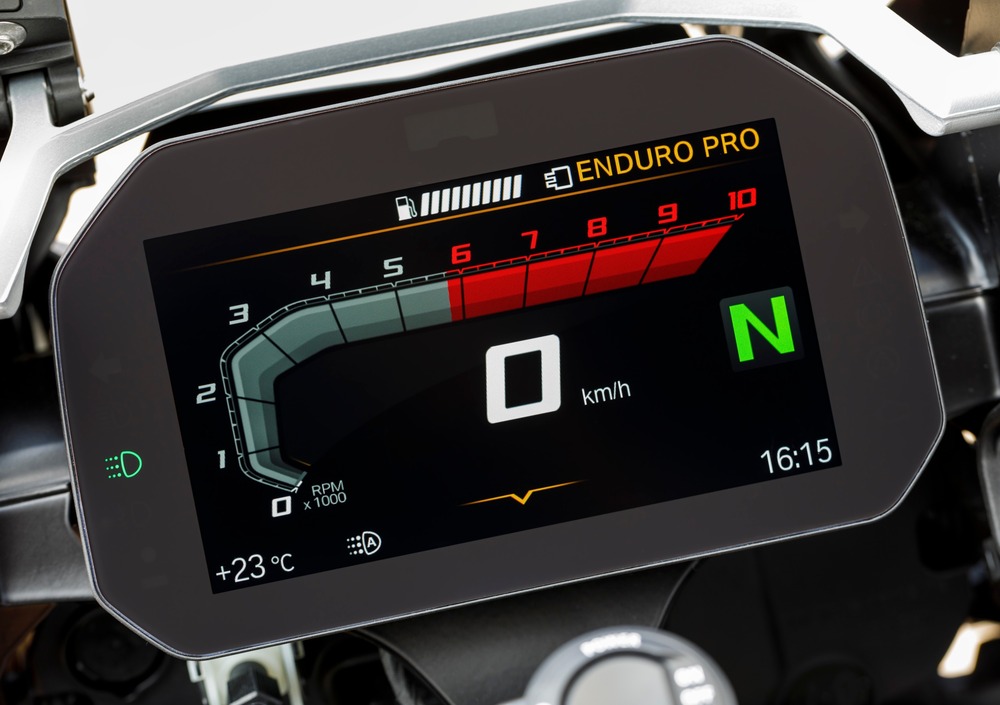 La Casa di Monaco giustifica l’aumento con la dotazione di serie cresciuta. Ora ci sono infatti la strumentazione TFT da 6,5 pollici, i fari a led, l’Hill Start Control e il sistema di ausilio in frenata DBC (che chiude le farfalle nelle frenate di emergenza). Standard sono anche i due riding mode (road e rain) e il controllo di trazione ASC. I riding mode pro (dynamic e enduro) sono invece optional e prevedono interventi più precisi e personalizzabili del controlli di trazione e dell’ABS. Come anticipato, l’ESA è di tipo attivo e regola quindi non solo la parte idraulica, ma anche il precarico dell’ammortizzatore posteriore in funzione del peso.