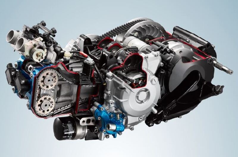 E' spinto da un bicilindrico parallelo di 550,4 cc, con distribuzione bialbero e otto valvole, imbiellaggio a 270° e alimentazione a iniezione con doppia mappa selezionabile dal manubrio: piena potenza e pioggia. La frizione è a bagno d'olio, il variatore sfrutta una speciale cinghia e a cinghia dentata è pure la trasmissione finale. Eroga 53,5 cv a 7.500 giri e la coppia massima è di 5,7 kgm (56 Nm) a 5.500 giri. Il motore ha funzione portante per il forcellone bibraccio in alluminio, che muove un ammortizzatore disposto lateralmente e in posizione quasi orizzontale.