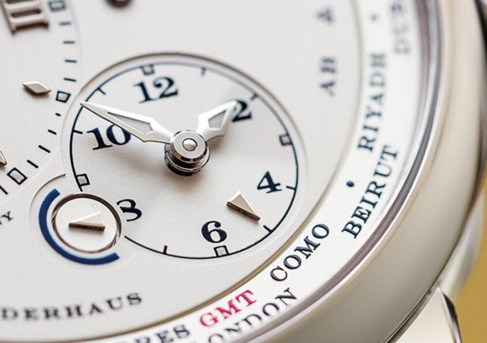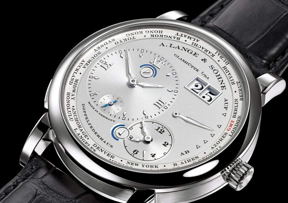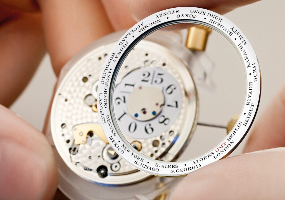 Il Lange 1 Time Zone offre le funzioni di ora locale, indicazione del giorno e notte, ora e minuti del fuso orario con indicatore giorno e notte, cerchio delle città, Grande Data in una doppia finestrella riferita all’ora del fuso orario di casa e indicatore della riserva di carica.
