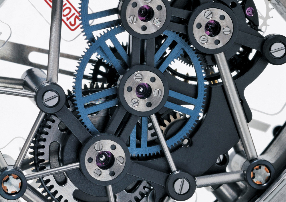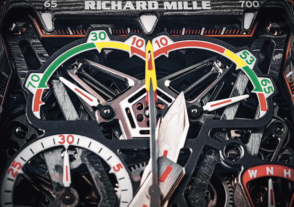A far muovere le lancette ci pensa il movimento automatico RMAC3: nato nel 2016, con un cronografo flyback alimentato da due bariletti in parallelo e gestito da un bilanciere a inerzia variabile, il movimento ha un’autonomia di 55 ore. La carica delle molle dei bariletti è assicurata da un rotore a geometria regolabile, personalizzabile a seconda dell’attività di chi lo indossa.