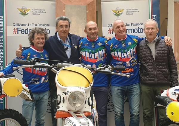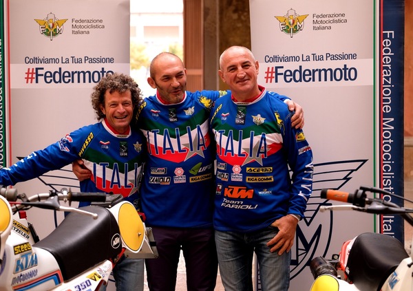 I tre grandi campioni Stefano Passeri, Mario Rinaldi e Giovanni Sala vestiranno la Maglia Azzurra nella competizione inizialmente proposta alla Federazione Internazionale dal Presidente FMI, Giovanni Copioli. Plurititolati, ognuno vincitore di quattro Sei Giorni con l'Italia, gli atleti nella prima parte della giornata odierna – organizzata in collaborazione con il Moto Club Guastalla del Presidente Alberto Germani, coadiuvato da Giuseppe Mandurino - hanno partecipato ad una conferenza stampa che ha visto gli interventi del Sindaco di Guastalla, Camilla Verona, dell’Assessore al Turismo, Ivano Pavesi, del Coordinatore del Comitato Enduro FMI, Franco Gualdi, del Team Manager della formazione vintage, Francesco Mazzoleni e dei piloti stessi.