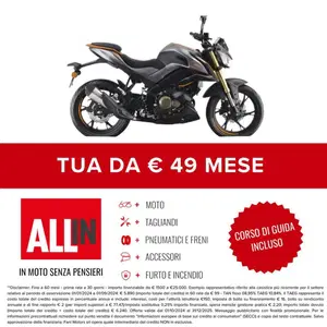 Moto Nuova ( possibilità di permuta usato come anticipo ) disponibile in tulle le colorazioni - vedi listino costruttore Esempio informativo ( salvo approvazione finanziaria )Anticipo € 600 + 49x36 + 1628 € riscattoConsegniamo in tutta Italia isole comprese!Per maggiori info contatta un nostro consulente!Disclaimer:L'annuncio indica il listino di partenza tra le colorazioni disponibili, salvo promo e/o altro incentivo in corso ( f.c.)Le rate mensili potrebbero variare in base alle richieste del singolo cliente.Formula ALL-IN = Anticipo + 12/24/36/48 rate + riscatto ( Può includere - Accessori/Furto/Incendio/Tagliandi/Gomme/Freni/Estensione garanzia )Eventuali accessori o altro sono da considerarsi inclusi/esclusi come da indicazione listino costruttore.