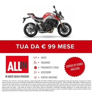 Moto disponibile in pronta consegna ( salvo esaurimento scorte ) in tutte le colorazioni disponibili a listino - vedi sito costruttore.Finanziamenti su misura per rendere l’acquisto ancora più semplice.Consegna in tutta Italia, isole comprese.Eventuali accessori non inclusi nel prezzo indicato.Valutiamo la tua permuta! Inviaci foto e descrizione della tua moto usata per ricevere il miglior preventivo personalizzato.Fani Motors è Firenze dal 1975 nelle sue 4 sedi con oltre 20 marchiContatta un nostro consulente saremo felici di risponde alle tue domande!Disclaimer:L'annuncio può indicare il prezzo di partenza tra le colorazioni del listino, salvo promo e/o altro incentivo in corso, esclusa immatricolazione e messa su strada.Le rate mensili potrebbero variare in base alle richieste del singolo cliente.Formula ALL-IN = Anticipo + 12/24/36/48 rate + riscatto ( Può includere - Accessori/Furto/Incendio/Tagliandi/Gomme/Freni/Estensione garanzia )Eventuali accessori o altro sono da considerarsi inclusi/esclusi come da indicazione listino costruttore