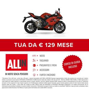 Moto Nuova ( possibilità di permuta usato come anticipo ) disponibile in tulle le colorazioni - vedi listino costruttore Esempio informativo ( salvo approvazione finanziaria )Anticipo € 5900 + 129x36 + 3970 € riscattoConsegniamo in tutta Italia isole comprese!Per maggiori info contatta un nostro consulente!Disclaimer:L'annuncio indica il listino di partenza tra le colorazioni disponibili, salvo promo e/o altro incentivo in corso ( f.c.)Le rate mensili potrebbero variare in base alle richieste del singolo cliente.Formula ALL-IN = Anticipo + 12/24/36/48 rate + riscatto ( Può includere - Accessori/Furto/Incendio/Tagliandi/Gomme/Freni/Estensione garanzia )Eventuali accessori o altro sono da considerarsi inclusi/esclusi come da indicazione listino costruttore.