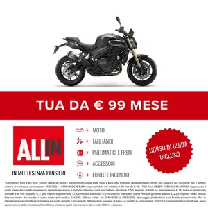 Moto Nuova ( possibilità di permuta usato come anticipo ) disponibile in tulle le colorazioni - vedi listino costruttore Esempio informativo ( salvo approvazione finanziaria )Anticipo € 2750 + 99x36 + 3059 € riscattoConsegniamo in tutta Italia isole comprese!Per maggiori info contatta un nostro consulente!Disclaimer:L'annuncio indica il listino di partenza tra le colorazioni disponibili, salvo promo e/o altro incentivo in corso ( f.c.)Le rate mensili potrebbero variare in base alle richieste del singolo cliente.Formula ALL-IN = Anticipo + 12/24/36/48 rate + riscatto ( Può includere - Accessori/Furto/Incendio/Tagliandi/Gomme/Freni/Estensione garanzia )Eventuali accessori o altro sono da considerarsi inclusi/esclusi come da indicazione listino costruttore.