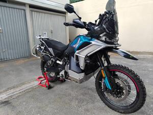 Griglia parafaro Parabrezza leggermente più alto fumè (incluso anche originale) Specchietti reclinabili (oltre ad originali) Manopole in gomma morbida Traversino portacellulare agganciato direttamente dietro alla strumentazione (più solido e non si alza e abbassa assieme al parabrezza) Pellicola su strumentazione tft Barre paracarene alte Faretti led anabbaglianti sotto chiave Paramani con anima in acciaio (prodotto di fascia alta, no cinesata) Leva frizione a manubrio corta Leva attuatore fruizione maggiorata "One finger" per ammorbidire la frizione Calze acerbis per copertura steli Forcella Adesivi rilievo in gomma antiscivolo su parte alta serbatoio per Maggiore grip Paracoppa in alluminio ad alto spessore a copertura totale di tutta la parte bassa della moto Griglia aggiuntiva tra radiatore e paracoppa per preservare collettori di scarico e clacson da eventuali pietre Para serbatoio liquido freno posteriore in alluminio Piastra para calore tra catalizzatore e monoammortizzatore Telai porta valige in acciaio colorazione silver Piastra portapacchi GIVI trekker in alluminio Portatarga corto in alluminio e originale in plastica Ulteriori telai laterali (in eventuale sostituzione degli attuali)per valige morbide Adventure Pneumatici mitas enduro Trail plus 50% posteriore, 70% anteriore + gomme originali direi a circa l'80% di vita Copertura sella a nido d'ape che aumenta comfort di seduta e termico Iat Aftermarket per ingrassare leggermente la carburazione e rendere l'erogazione più fluida