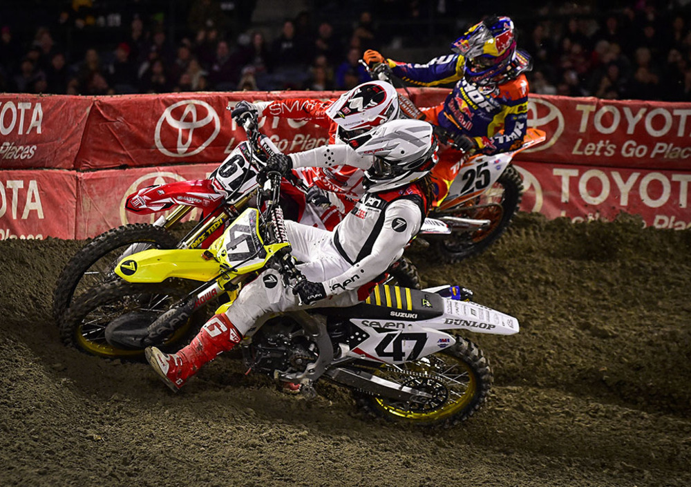 Dopo due vittorie consecutive, il sogno di Ken Roczen si è infranto al 9° giro della finale della terza tappa Supercross, rompendosi un braccio e consegnando la gara a Ryan Dungey ed al suo compagno di squadra Marvin Musquin. Nella gallery potrete gustarvi le foto più spettacolari della competizone, corsa a Los Angeles su un terreno molto insidioso.