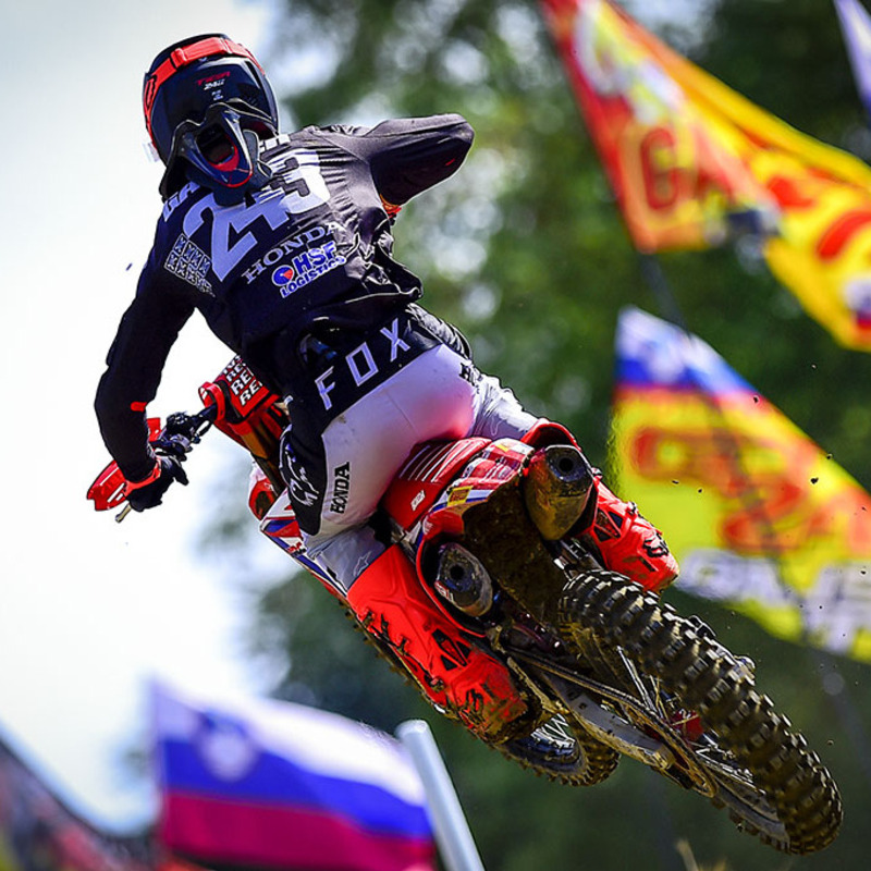 Dopo la zampata nelle prove cronometrate di Jeffrey Herlings, che ha rifilato mezzo secondo allo sloveno, la manche di qualifica si è aperta all’insegna dell’ufficiale HRC, che è partito in testa ed è rimasto al comando sino a metà gara, quando una scivolata lo ha costretto a rallentare per la botta presa al collo relegandolo in 13ª posizione.