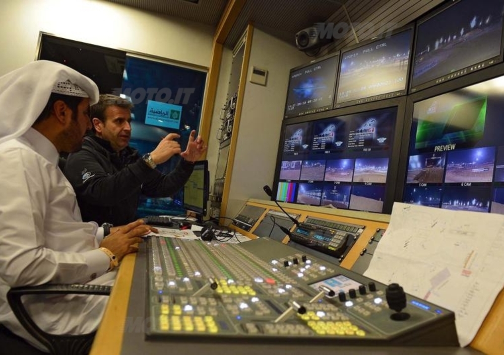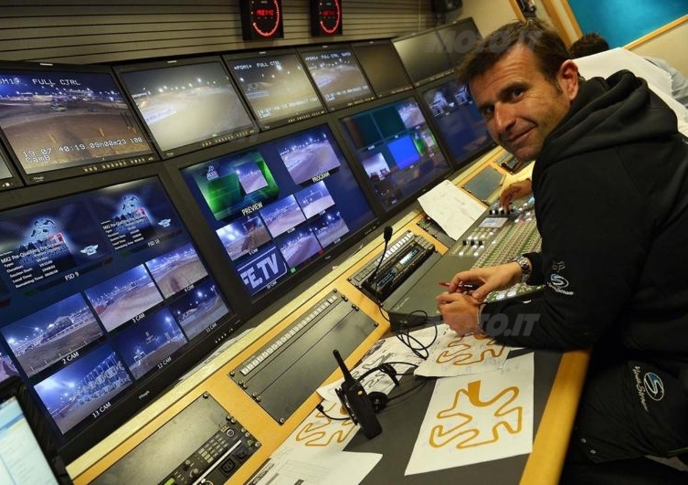 «Oltre a me c’è un assistente che mi dà le dritte quando succedono certe battaglie che non riesco a vedere, poi c'è il grafico, il mixer video che mi sta di fianco e che cambia la sequenza delle telecamere in base all'ordine che gli do, il tecnico audio con l'assistente che si occupa dei suoni e dei microfoni, due operatori che si occupano del controllo delle camere, dalla scelta dei diaframmi alla colorimetria delle immagini perché i cameraman che sono in posta mettono solo a fuoco e segue i piloti ed un altro paio dedicati alle scene rallentate e agli high lights che utilizzano la nuova K2 Dyno della Grass Valley, una grossa società americana che fabbrica anche i mixer ad alti livelli, così versatile che la usano anche nella MotoGP».