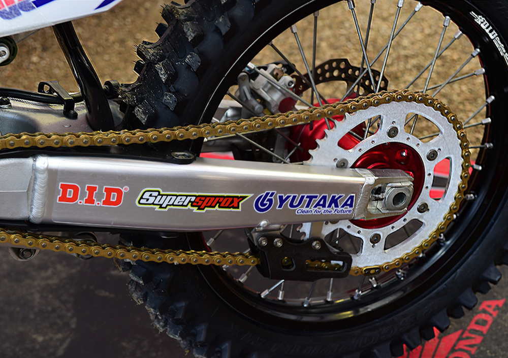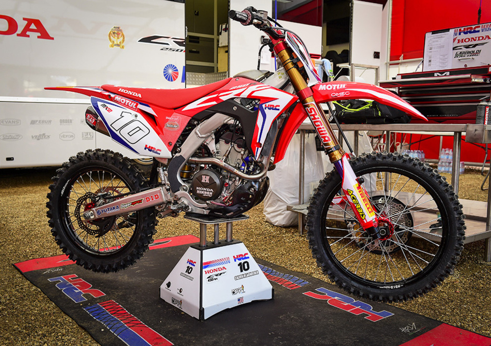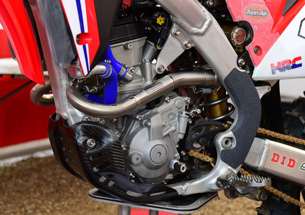 «Innanzitutto abbiamo lavorato sul setting delle sospensioni Showa Factory, sia per quanto riguarda la forcella ibrida aria/molla dotata di steli da 49 mm, che è praticamente uguale a quella della 450, che per il mono Showa BFR, che differisce totalmente da quello di serie, è realizzato esclusivamente per il team HRC ed è riconoscibile per avere tutte le regolazioni nella parte superiore del corpo. Il telaio deriva da quello di serie, mentre i leveraggi sono ridimensionati in funzione delle preferenze del pilota. Abbiamo inoltre due diversi serbatoi in titanio, uno per le gare su sabbia, di capienza maggiorata, una cassa filtro in carbonio che mantiene però le stesse dimensioni di quella di serie, e freni Nissin ufficiali, più precisi e potenti sia per la struttura della pinza che per l’utilizzo di tubi diversi».