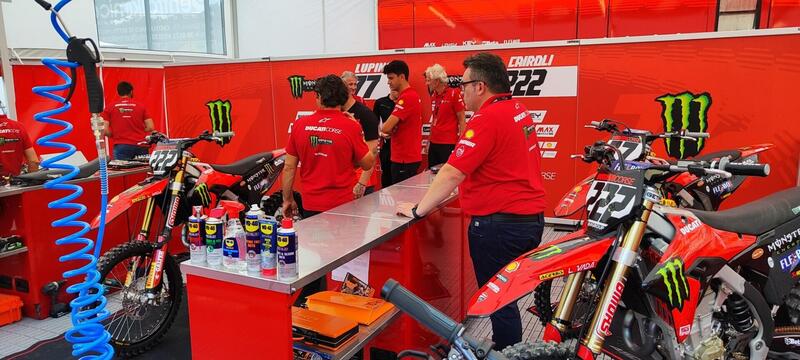 Sotto la tenda Ducati Corse Off-Road il Team è concentratissimo. Le ultime operazioni prima che Tony, ma anche Alessandro Lupino, scendano in pista, sono metodiche, minuziose, improntate alla massima concentrazione. A volte sembra che le operazioni siano marginali, come sistemare una tabella porta numero o controllare l’altezza del retro-sospensione della Desmo450 MX, oppure scaricare un’altra cartella di dati di telemetria per essere una volta di più sicuri che anche l’iter informatico segue la precisione del lavoro e dell’attenzione.