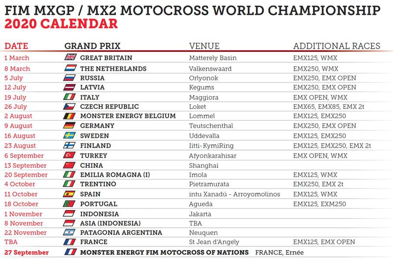 ha stabilito che alcuni eventi verranno posticipati. Il GP di Russia, in programma per il 7 giugno a Orlyonok, è rinviato al 5 luglio, mentre l'MXGP di Lettonia si sposterà dal 14 giugno al 12 luglio.