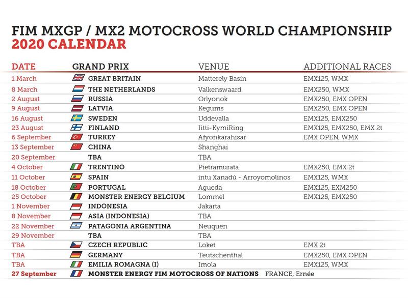 Ad oggi, la serie di appuntamenti riprende con 4 GP consecutivi ad iniziare da quello della Russia, che si correrà a Orlyonok il 3 agosto, seguito da Lettonia (Kegums), Svezia (Uddevalla) e Finlandia (Itty-KymiRing), per proseguire, dopo un weekend di riposo con 9 tappe, intervallate dal Motocross delle Nazioni previsto in Francia il 27 settembre e dalla data del 20 settembre con località ancora da definire, che comprende i GP della Turchia, Cina, Trentino, Spagna, Portogallo, e del Belgio, che precederà le due prove indonesiane.
