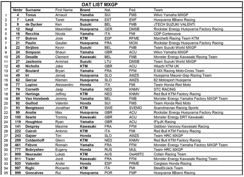 Tra queste, 13 schierano un solo pilota, 14 due conduttori, 9 tre atleti, mentre il team Husqvarna 8BIANO Racing si presenta nel paddock con ben quattro elementi. Le squadre seguite più direttamente dalle Case madri sono una decina, tra le quali spicca la TM, unica azienda italiana ad essere impegnata nel Gotha del cross iridato.