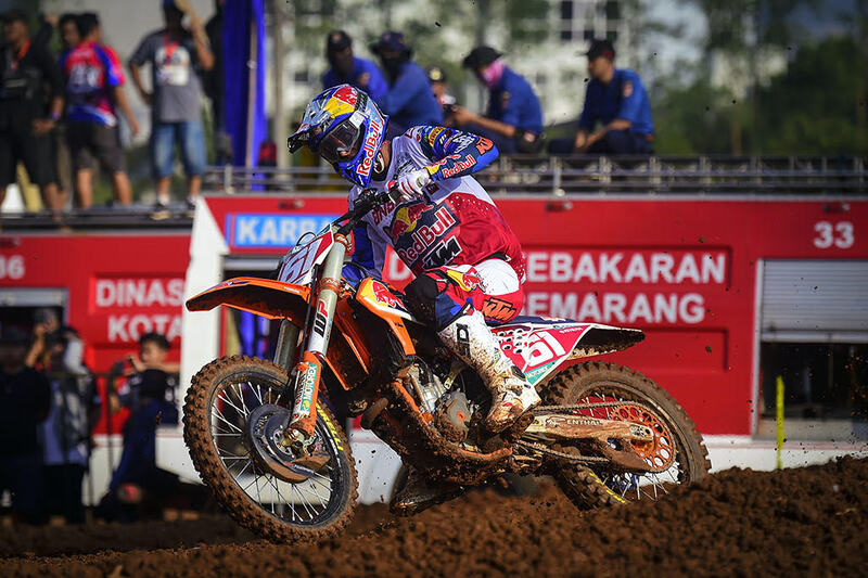 SEMARANG - La 12a tappa iridata è iniziata con la prova di forza di Romain Febvre, che dopo aver firmato il miglior tempo cronometrato si è confermato anche nella manche di qualificazione. Partito 3°, l’ufficiale Yamaha Monster Energy si è subito distinto per la determinazione, che lo ha portato prima a scavalcare Tim Gajser, e poi, a pochi giri dal traguardo, anche il battistrada Glenn Coldenhoff, che lo hanno seguito nell’ordine.