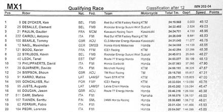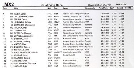 Jeffrey Herlings, che al primo giro si è ritrovato in diciottesima posizione e che ha sudato sette camicie per recuperare sino la quarto posto. La vittoria è andata quindi alla seconda guida KTM Jordi Tixier, che per quasi tutta la gara ha inseguito