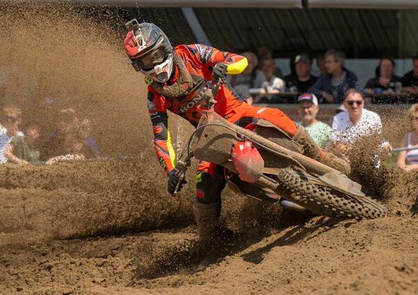 L’MX2 non tiene più con il fato sospeso. Diciamo che ha sedimentato uno status che all’inizio poteva anche essere “sospetto”. Kay de Wolf vince il suo sesto Gran Premio stagionale. Il Compagno Nestaan Husqvarna, Lucas Coenen, ne ha vinti quattro. Restano 4 successi, distribuiti equamente tra Liam Everts e Sacha Coenen, che in un certo senso “congelano” la stagione su un dato di fatto: possiamo già scommettere su chi vincerà il Mondiale. Le eventuali incertezze si spalmano più che altro su delusioni, aspettative eccessive, o disarmanti “normalità”. Sulla genetica che non esplode ancora nel sistema Everts di terza generazione, KTM, sulla gloria che non sospinge così bene la stagione di Andrea Adamo Campione del Mondo, KTM, sul fatto che il terzo posto premi la costanza di Simon Laengenfelder, GasGas (peraltro protagonista di uno show di ritrovata aggressività in Gara 2, vinta).