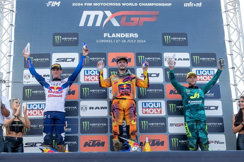 Lommel, Belgio, 28 Luglio. Pronostico rispettato. Jeffrey Herlings, Red Bull KTM, vince con una chiara doppietta il Gran Premio delle Fiandre MXGP. Week end pressoché perfetto (solo 1 punto di Qualyfing e lo sarebbe stato), ma il “minus” è quel graffio di circostanza che umanizza il replicante… di sé stesso. Fantastico! Si inchinano sul podio del GP un grande Jorge Prado, GasGas, tornato allo smalto del Campione completo e pericolosissimo, e un quasi commovente Romain Febvre, Kawasaki, difficile da credere così competitivo alla seconda uscita dal… rientro dopo la lunga convalescenza. Tim Gajser non è smagliante, ma c’è un piccolo mosaico di ragioni per spiegarlo, non ultima una certa “sobrietà” obbligatoria, logica, nella difesa della leadership.