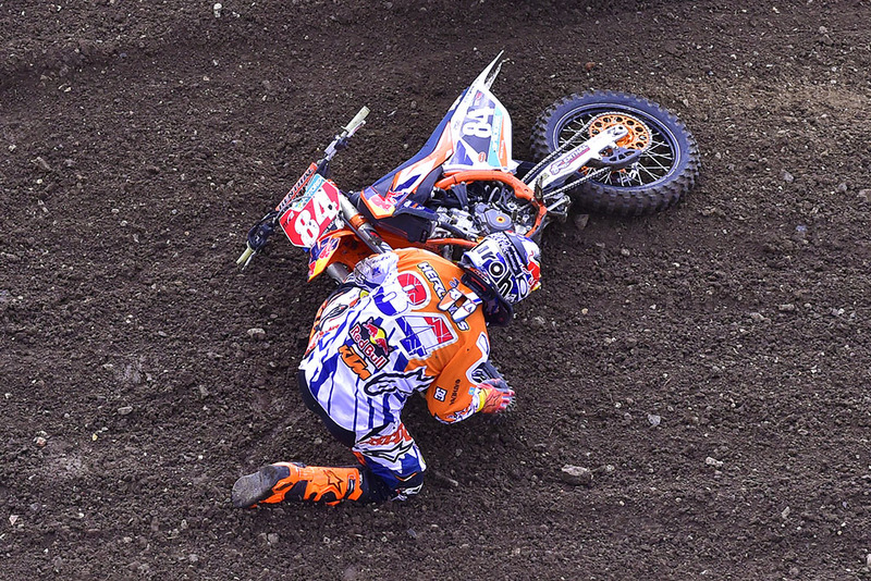 Nel corso dell’8° giro della qualifica, Jeffrey Herlings mentre si trovava in 13ª posizione si è intraversato in un salto ed è caduto. Una caduta priva di conseguenze, ma dopo aver rialzato la moto l’olandese è stato centrato da Jordi Tixier, riportando nel violento impatto la frattura dell’anca. Un ennesimo infortunio arrivato dopo la frattura del dito di una mano accusata in Svezia e quella della clavicola riportata nella spettacolare caduta di Teutschenthal.