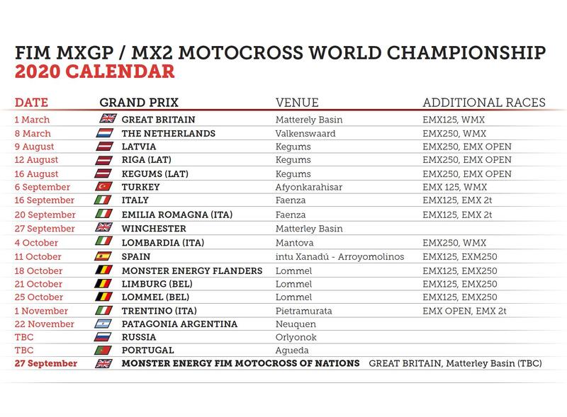Anche il format delle gare subirà variazioni: MXGP ed MX2 correranno tutta la gara in una sola giornata, la domenica. Libere e qualifiche si disputeranno la mattina, le gare al pomeriggio. In questo modo i piloti avranno pause più lunghe fra una gara e l'altra. Il sabato, stesso schema per Europeo e femminile.