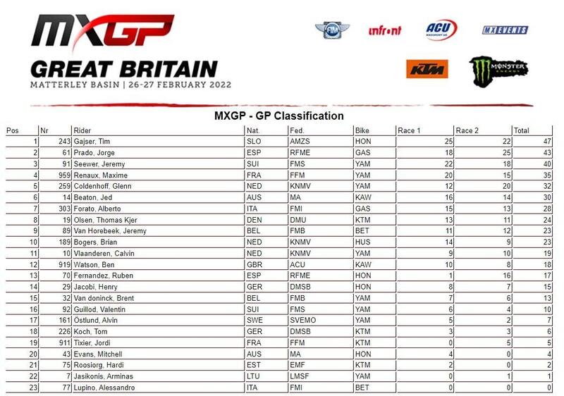 Spettacolo nella prima gara dell'anno del Mondiale di Motocross con un protagonista assoluto: Tim Gajser. Una settimana dopo il rinvio, causa tempesta Eunice, gli appassionati hanno potuto godersi giornate di sole nel circuito di Matterley Basin, nel WInchester. I piloti di MXGP e MX2 hanno dato il massimo nella prima prova della stagione. Il secondo appuntamento mondiale è tra una settimana in Lombardia, sul tracciato di Mantova. Di seguito i risultati della prima prova.