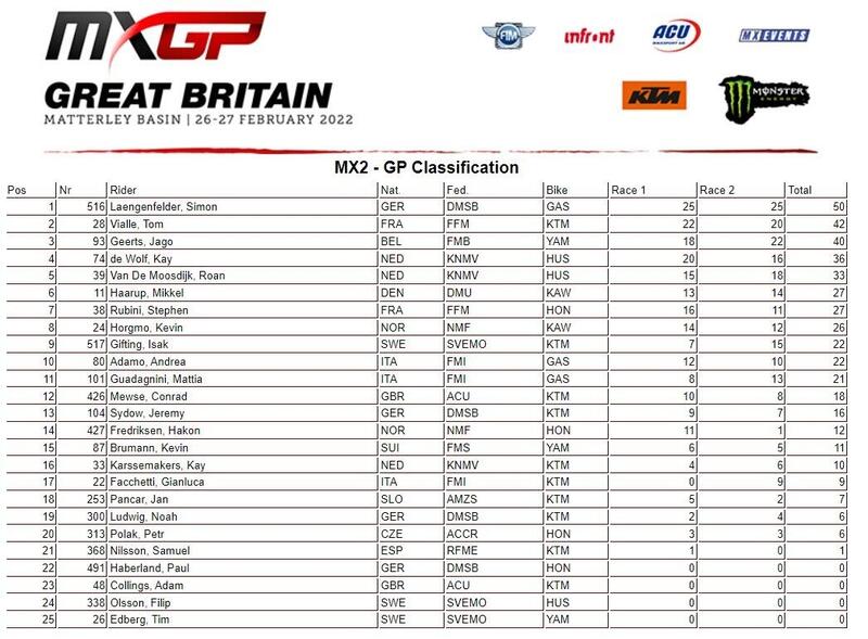 In MX2 è stato Simon Laengenfelder a trionfare. Il pilota tedesco ha vinto sia nella prima che nella seconda manche. Dopo l’ottima partenza, Laengenfelder si è alternato al comando con Tom Vialle (Ktm). Nel finale errore di Vialle e Laengenfelder è tornato al comando. Alla fine Vialle è secondo, terzo Geerts.