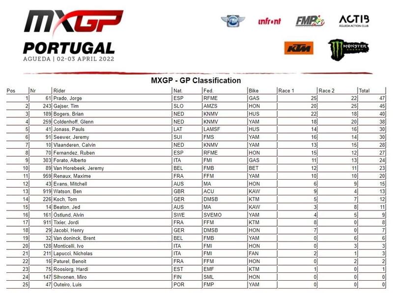 Per Prado vittoria in Gara 1 e secondo posto in Gara 2, 47 punti che bastano a renderlo campione di giornata davanti a Gajser che comunque limita i danni e chiude con 45 punti, frutto di un terzo e un primo posto.